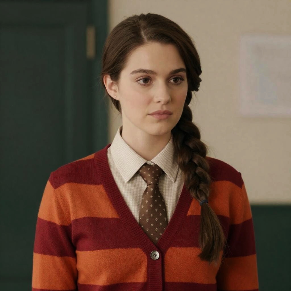 Photograph of a smiling woman with short brown hair, wearing a gray cardigan over a blue and white striped shirt, dimly lit background. She has fair skin and is looking slightly to the right. Dark, blurred background. Text "MovieStillDB.com" in bottom left corner.