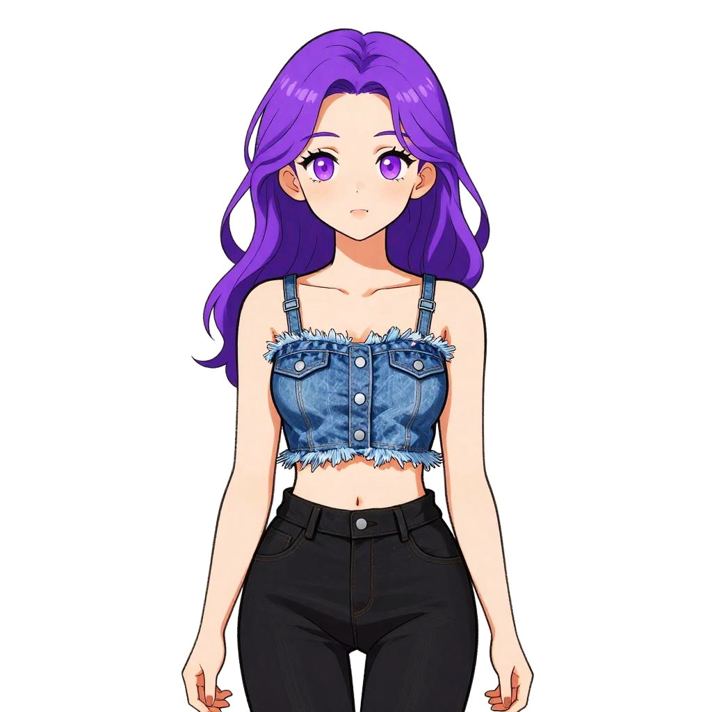 Digital drawing of a cute, anime-style woman with vibrant purple hair and purple eyes. She's wearing a denim crop top with frayed edges and black high-waisted jeans. Her top has thin straps and she's standing against a plain white background. The style is colorful and slightly bold, with clean lines and a simple, yet eye-catching look.