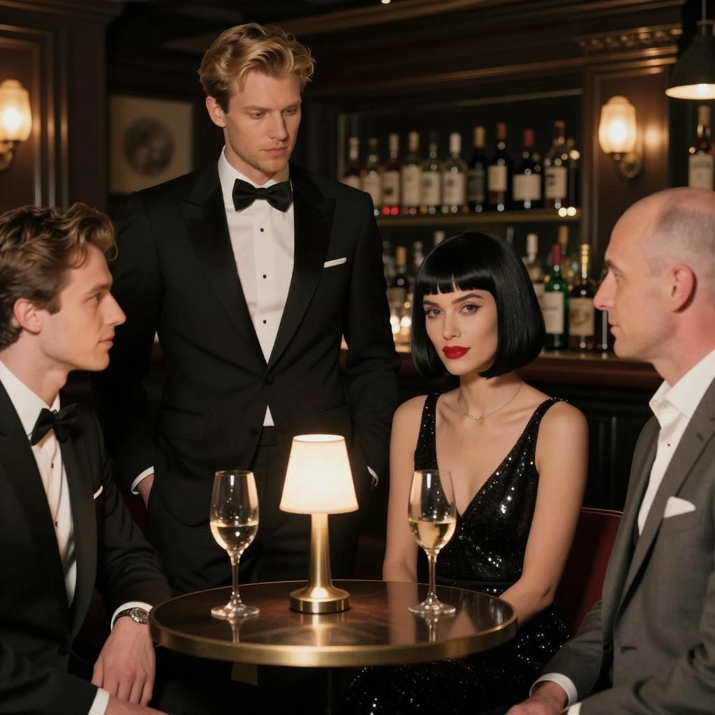 Nightclub scene. Four people. Man in black tuxedo with bow tie, blonde hair, standing behind round table with lamp. Woman with black bob haircut, red lipstick, black sequined dress, sitting at table. Man in black suit to left, partially visible. Bald man in gray suit to right, partially visible. Two wine glasses on table. Background: dimly lit bar with shelves of bottles.