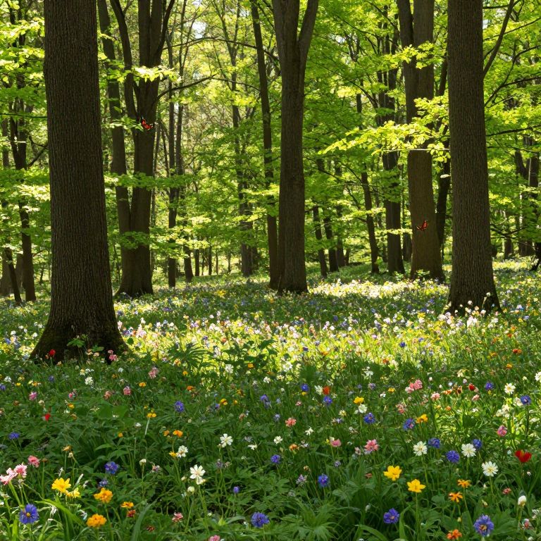 Lasy: a vibrant spring forest blossoming with colorful wildflowers among tall, leafy trees, bright sunlight casting dappled patterns on the forest floor, butterflies fluttering, ultra high-definition natural scenery with dynamic lighting