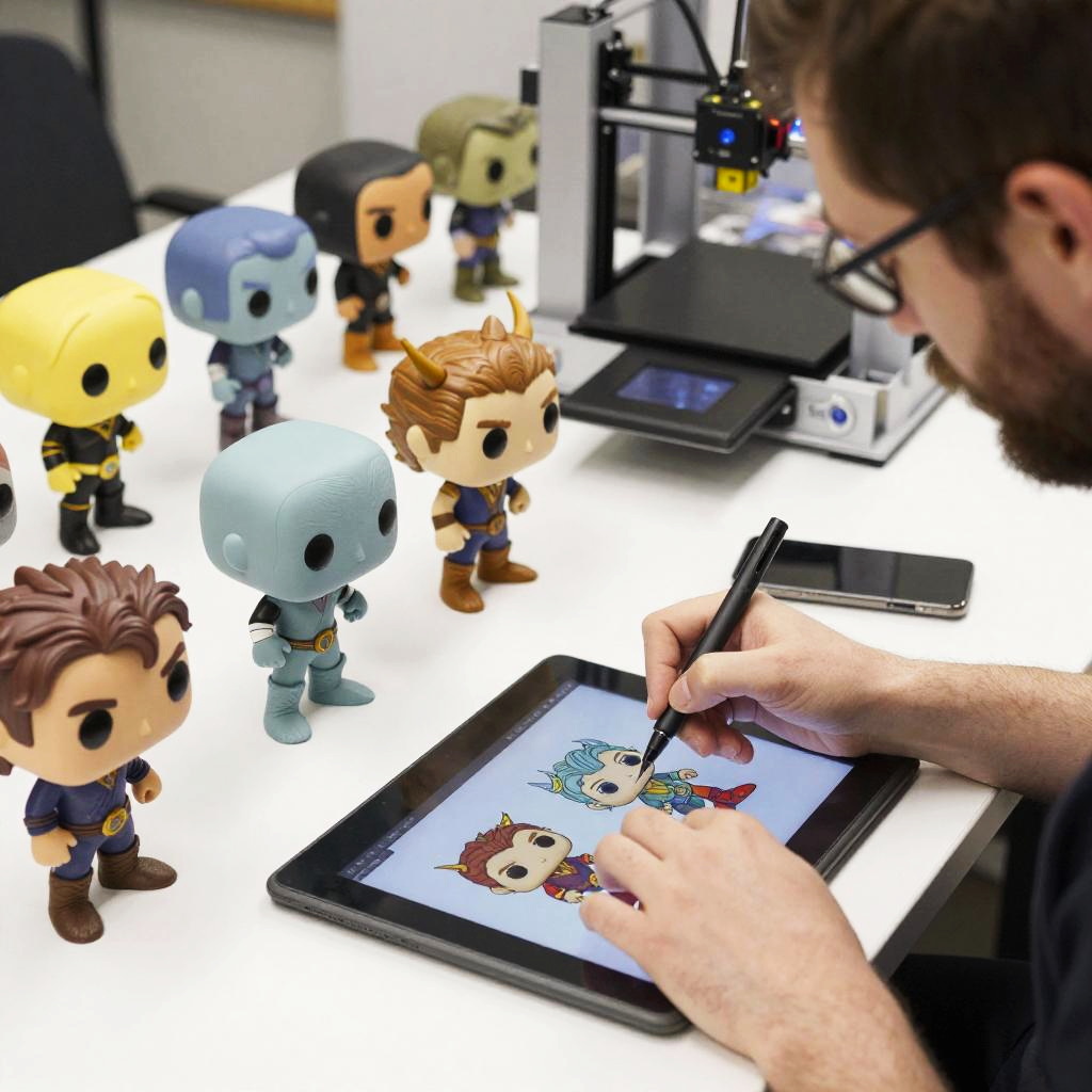 Funko Pop creator workshop filled with unique and imaginative custom figures inspired by fantasy and sci-fi themes, vibrant colors and dynamic poses, artist passionately working on a new design with digital tablet and 3D printer, photorealistic style.