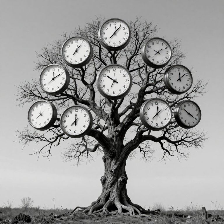 A gnarled, skeletal tree emerges from the earth, its barren branches transformed into an array of clock faces, each displaying a different, contradictory time, defying the linear flow of reality.