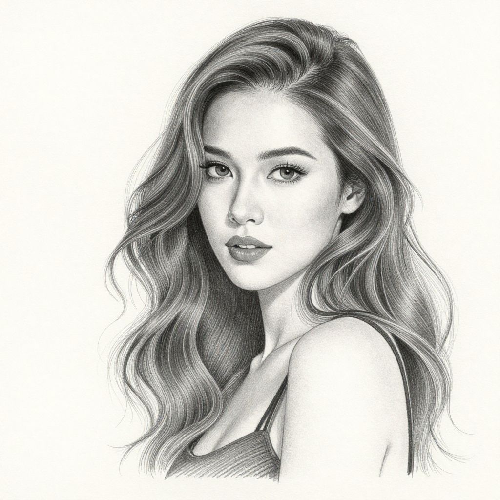 Black and white pencil drawing of a young woman with long, wavy hair and expressive eyes, looking directly at the viewer.