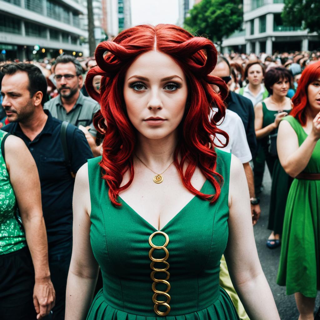 Cosplay Adult Medusa, woman with red hair and green dress in a crowd