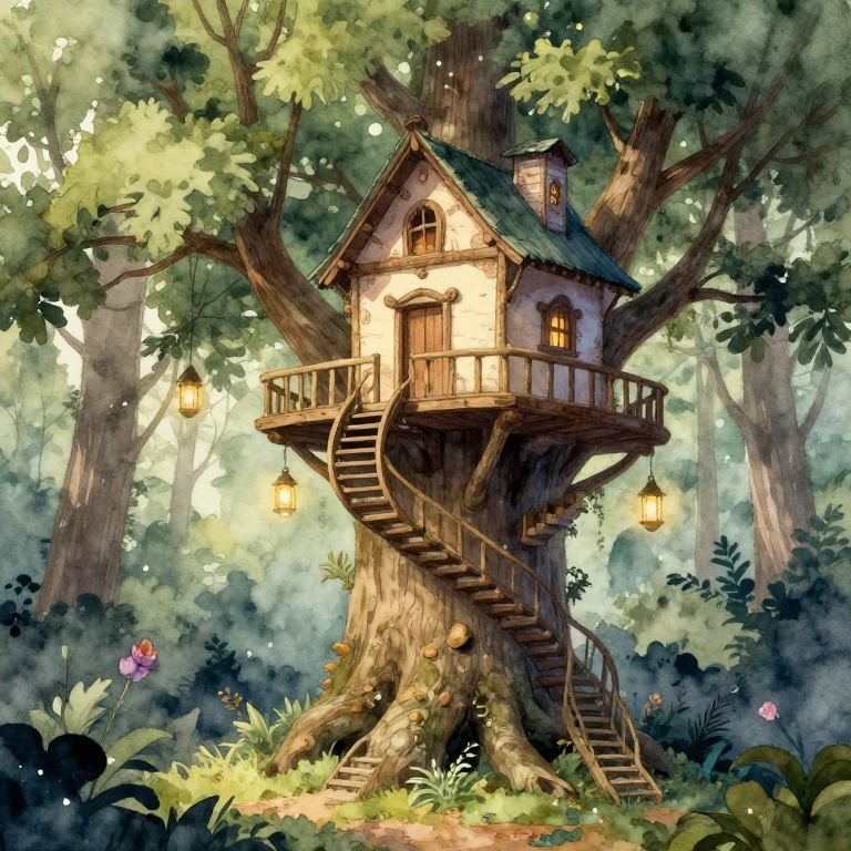 Small fantasy house perched atop a giant tree, wooden stairs winding around the trunk, lanterns hanging from branches, mystical forest background, dreamy and serene, watercolor style