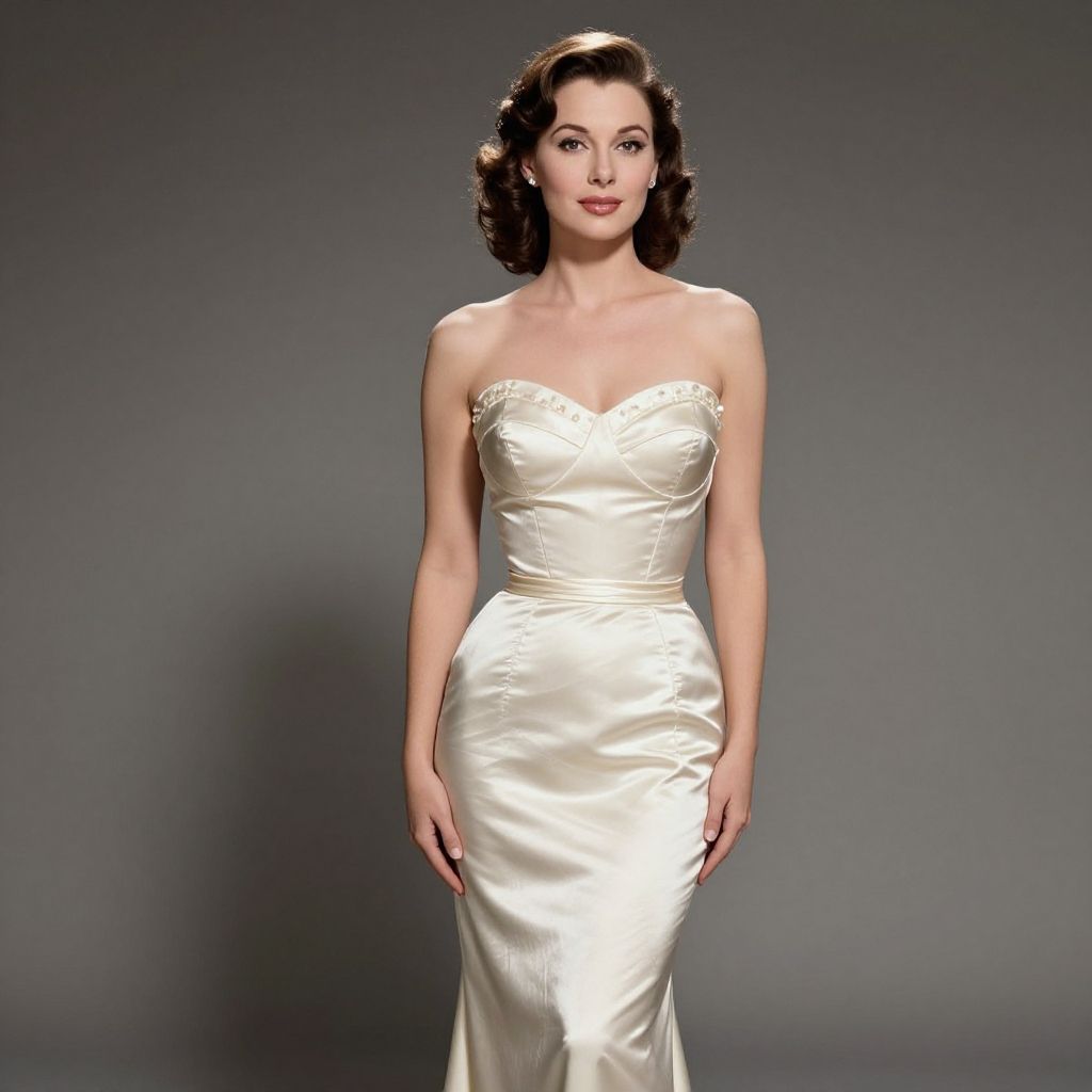 A woman poses elegantly in a strapless, form-fitting satin gown, evoking the timeless charm of classic film style. Her graceful stance and subtle smile add a touch of sophistication to the scene, reminiscent of old Hollywood glamour.
