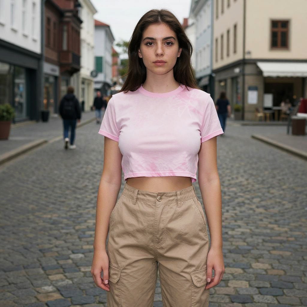Photograph of a young woman standing in a cobblestone street in a historic European town. She has light skin, brown hair tied back, and wears a bright pink, long-sleeve top with a keyhole cutout at the chest, accentuating her medium-sized breasts. She pairs the top with black leather pants. The background features blurred, colorful buildings with red roofs and a large, Gothic-style church with a tall spire. Several pedestrians, dressed in winter clothing, walk in the background. The image has a slight HDR effect, enhancing the colors and details.