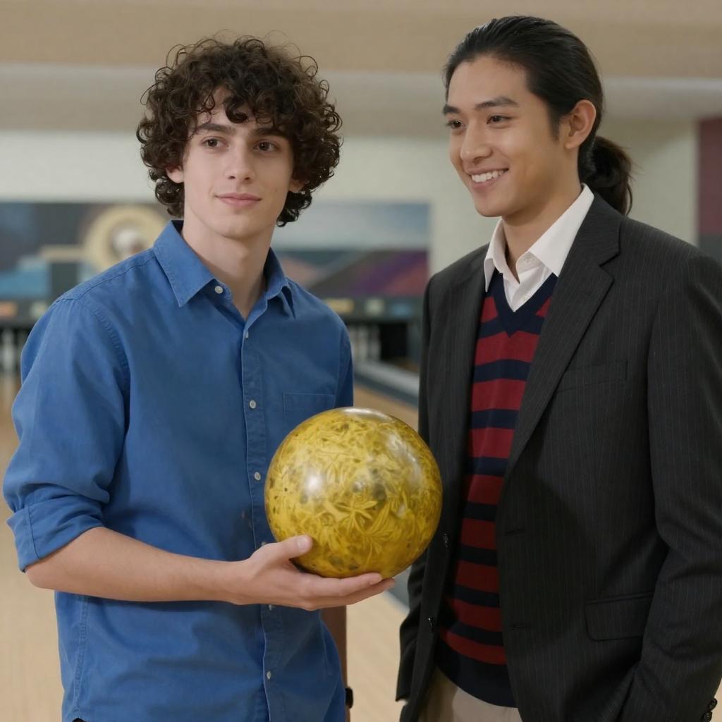 Photograph of two men in a lush garden. One man with curly brown hair, beige coat, and white shirt hands a violin to a man with short black hair, white shirt, and beige vest. Vibrant green foliage and trees in background. Man on left looks at man on right, who looks down at violin. Man on left's face is neutral, man on right's face is slightly downcast.