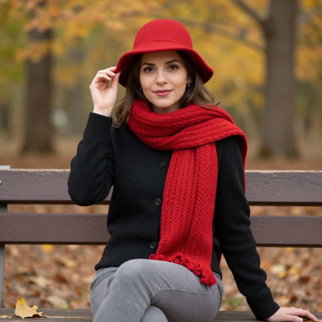 Photograph of a young woman with fair skin and brown hair, sitting on a wooden bench in an autumn park. She wears a bright red, wide-brimmed hat, a black knitted sweater with buttons, a red knitted scarf, and gray jeans. Her right hand adjusts her hat, and she smiles gently at the camera. The background features blurred trees with yellow and orange leaves, and fallen leaves on the ground. The image has a crisp, vibrant quality, emphasizing the contrasting colors of her red accessories against the autumnal backdrop.