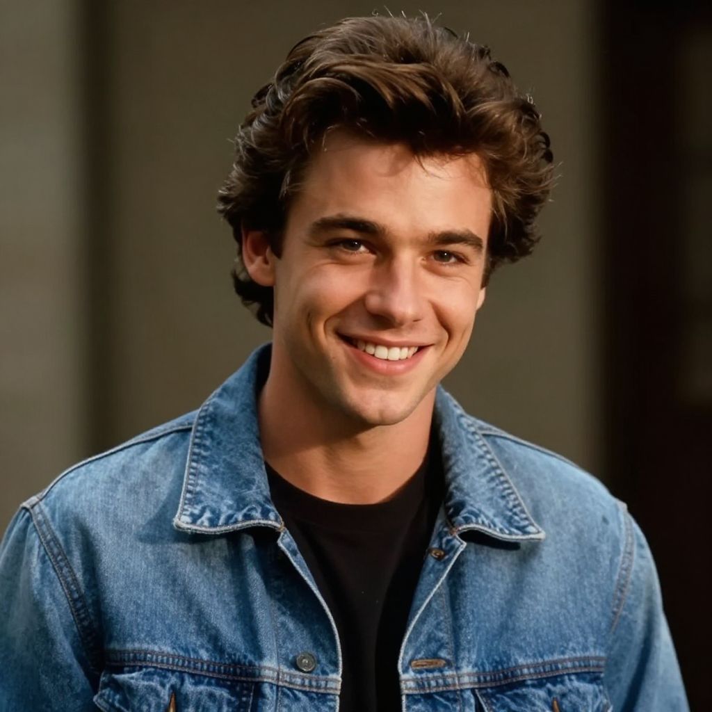 Portrait of young val.kilmer with a charismatic smile, styled hair and casual 80s outfit, soft natural light, high detail, film noir atmosphere, subtle background blur