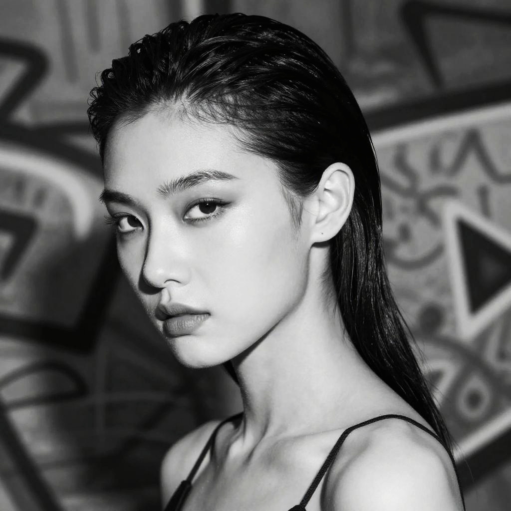 Pale skin and black hair, modern fashion editorial, high contrast black and white photography style, sharp shadows, bold makeup, sleek hairstyle, urban background with graffiti art, dynamic composition emphasizing edgy and sophisticated vibe.