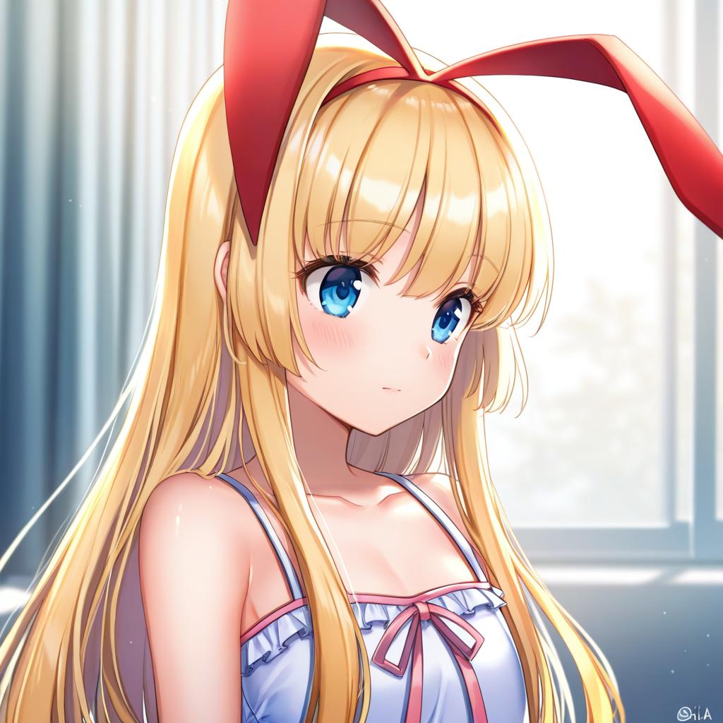 Illustration of an anime-style young girl with long blonde hair, blue eyes, and a flat chest. She is wearing a white sleeveless top with pink ribbons and rabbit ear hairband. The setting is indoors with soft natural light coming through a window in the background.