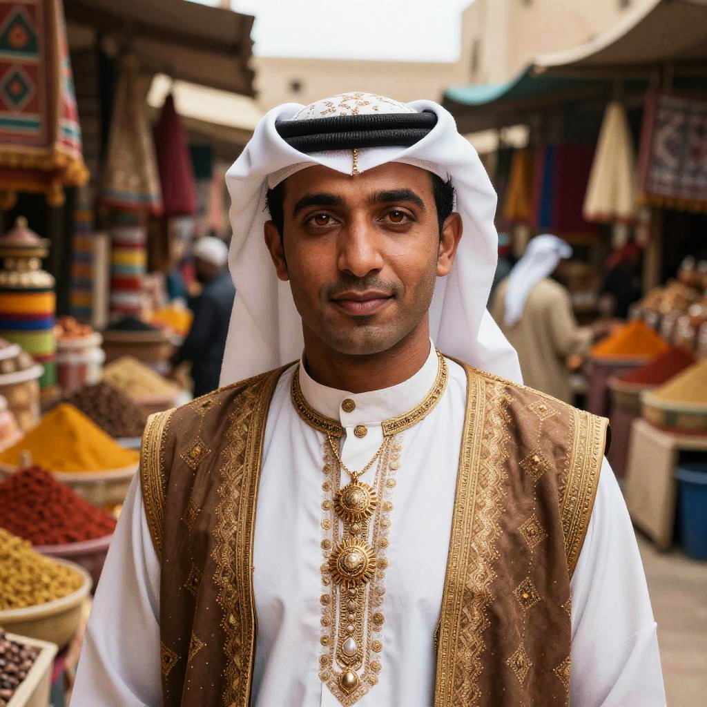 Photograph of a Middle Eastern man in traditional white thobe and gold-embroidered brown vest, standing in a colorful market stall.