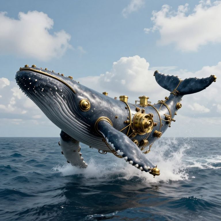 A steampunk whale, adorned with brass machinery and nautical rigging, glides serenely across the ocean, its mechanical body seamlessly merging with the natural form of a leviathan beneath a sky of scattered clouds.