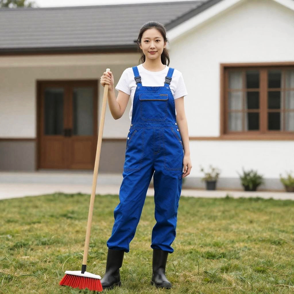 Yard Work Clothes, woman in overalls holding a broom in front of a house