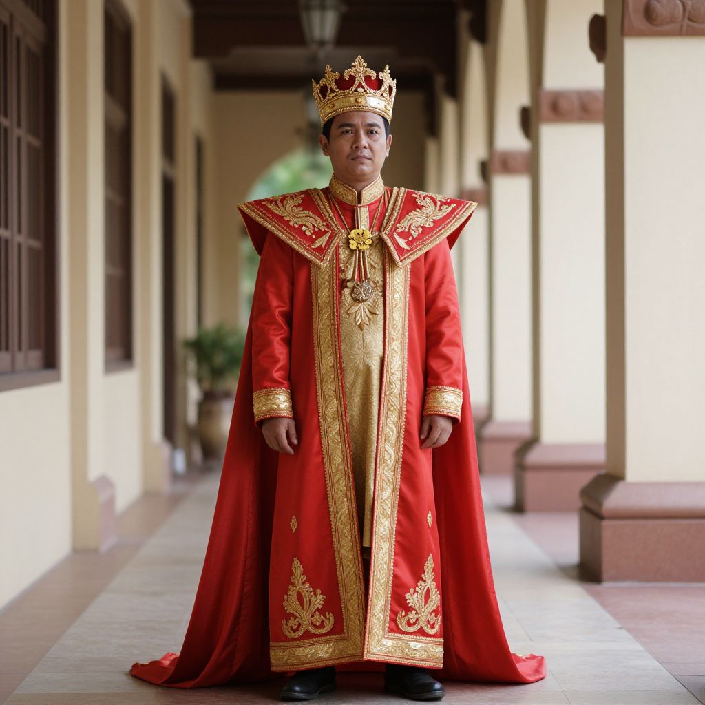 Photograph of a young man standing in a corridor, wearing an elaborate red and gold royal robe with intricate embroidery and a matching crown. The robe has a high collar and extends to the floor, adorned with fleur-de-lis motifs. The young man, with a serious expression, stands centered in the image, facing the camera. The corridor features yellow walls, brown wooden windows, and a tiled floor. Soft natural light filters through the corridor, highlighting the opulent details of his attire. The background is slightly blurred, drawing focus to the subject's regal ensemble.