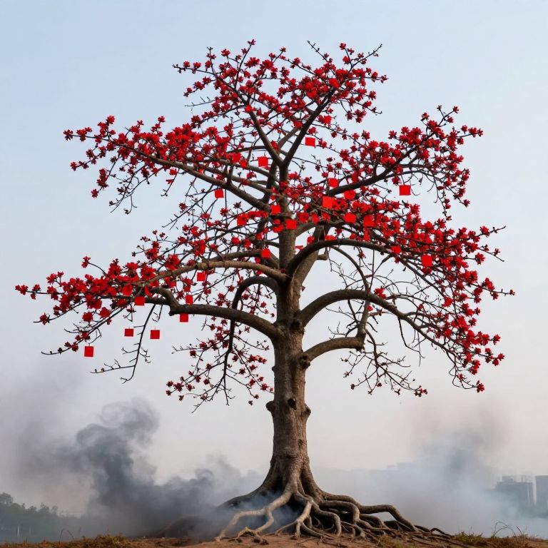 A gnarled tree stands defiantly, its sprawling branches adorned with vibrant red blossoms and interspersed with numerous red square cards, while its deep, twisting roots extend outward, enveloped by swirling gray smoke that billows beneath the serene, pale sky.