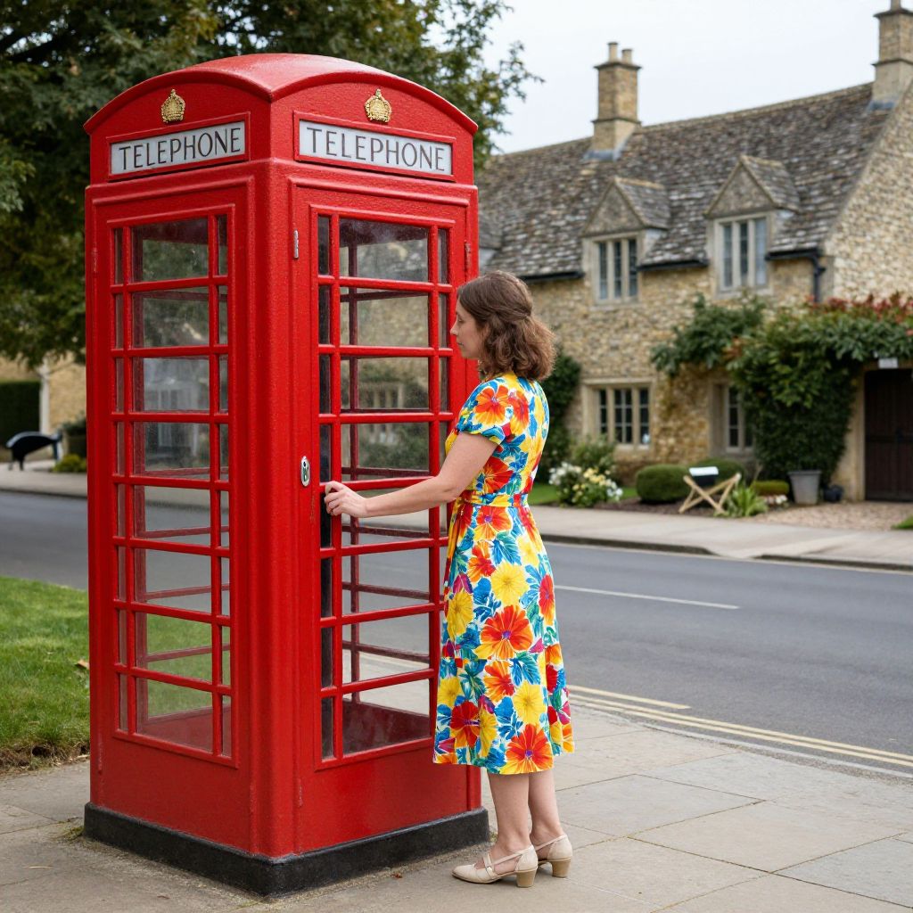 Woman in a vibrant floral dress opens the door of a classic red telephone box, set against the picturesque backdrop of Castle Combe, one of the Cotswolds' most charming villages.