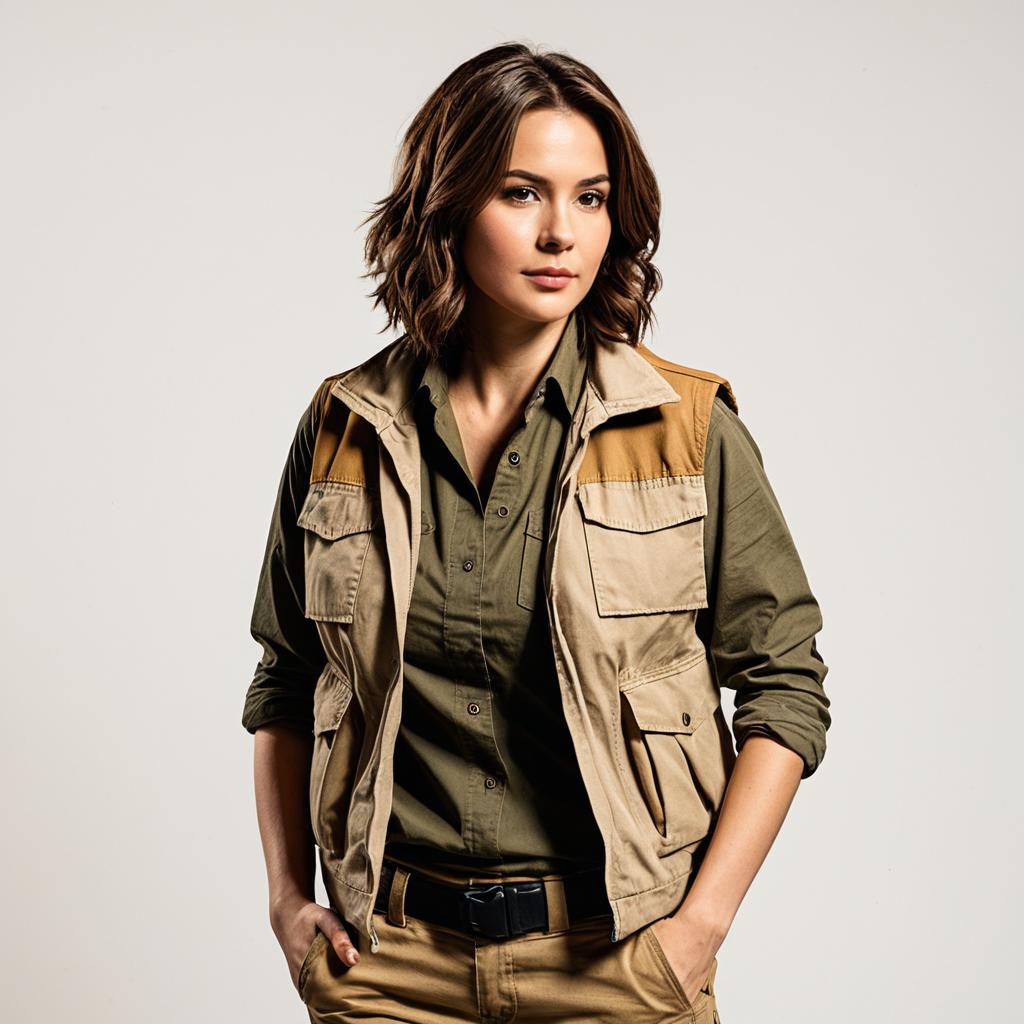 Cosplay costume, Bush Raylene, rugged tan vest over khaki shirt, cargo pants, messy shoulder-length brown hair, transparent background
