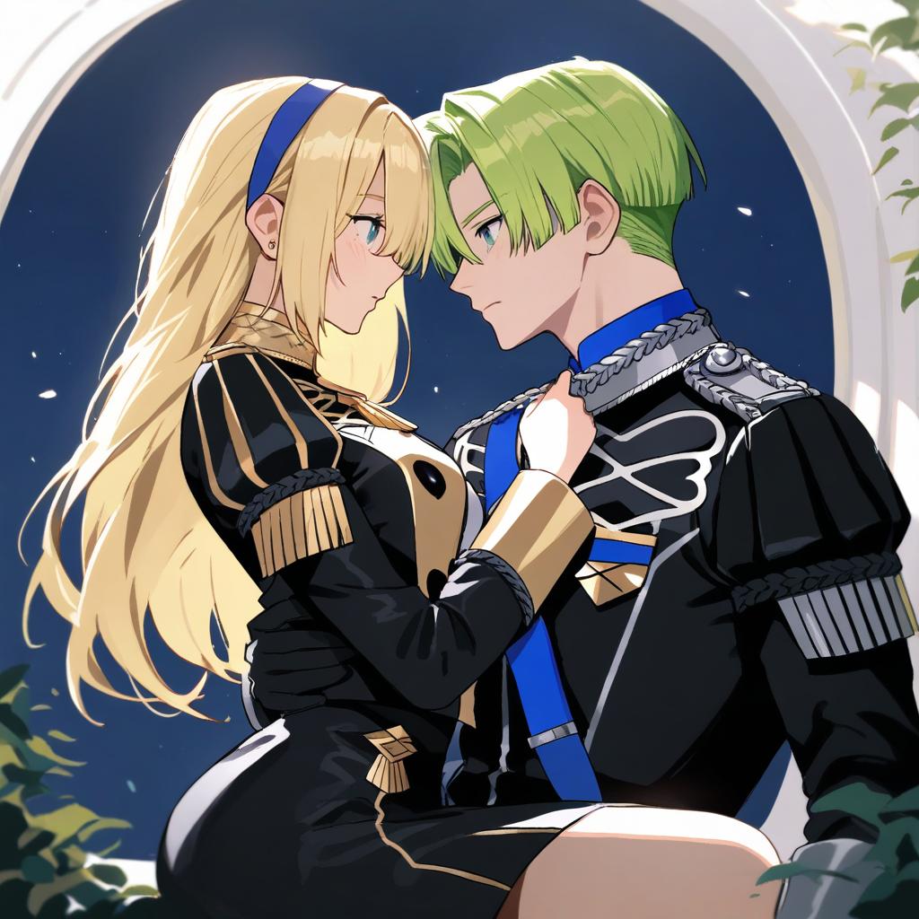 Digital illustration of an anime-style couple in a close, intimate pose against a circular window backdrop. The female character has long blonde hair with a blue headband and wears a detailed black and gold uniform. The male character has green hair, blue eyes, and is dressed in a black and silver uniform with blue accents. The scene evokes romance and tension between the two characters.