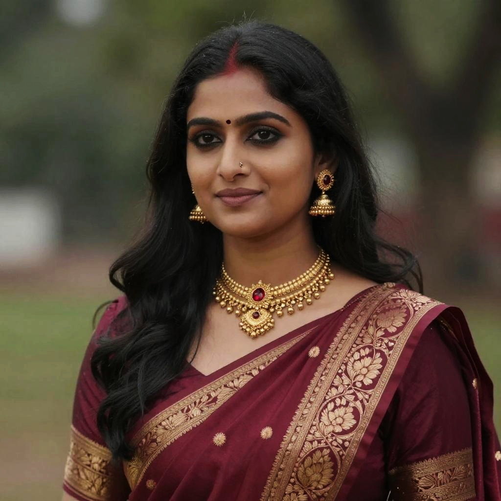 Portrait of a graceful Indian woman wearing a maroon saree with intricate gold embroidery. She has long black hair, a serene smile, and traditional gold jewelry including earrings and a necklace with red stones. She has a small bindi on her forehead and a nose piercing, representing traditional South Asian beauty.