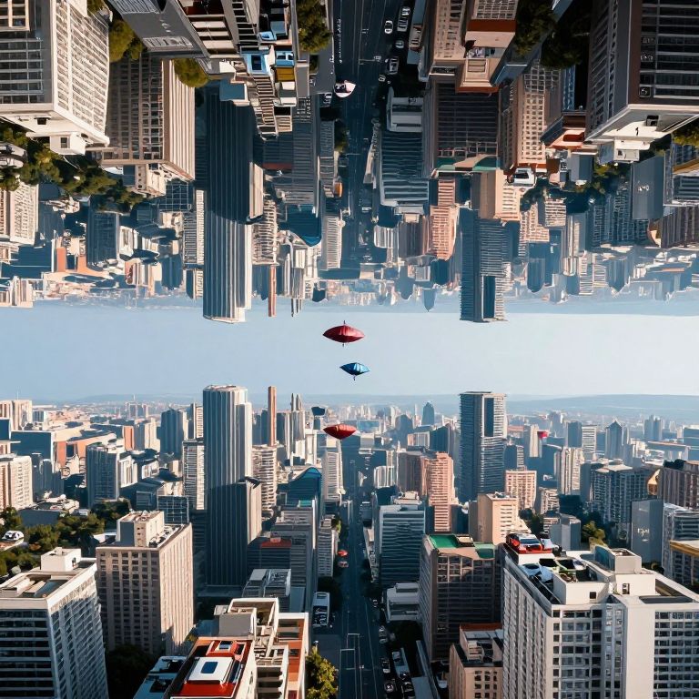 An extremely detailed cityscape exists entirely upside down beneath a reflecting pool, where inverted cars and floating umbrellas navigate an invisible mirrored world.