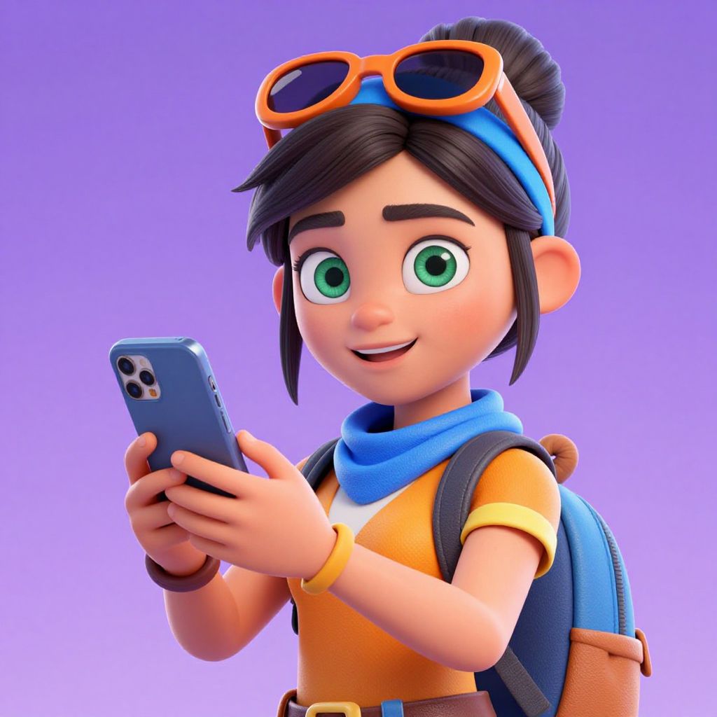 This digital 3D cartoon-style image features a young girl with large green eyes, black hair tied in a bun, and orange goggles on her head. She wears a blue headband, orange shirt, blue scarf, and a blue backpack with an orange strap. She is smiling while holding a blue smartphone with both hands. The background is a gradient of light purple to white. The girl's skin is smooth and light-toned, and she has a cheerful expression. The overall style is vibrant and playful, with bold colors and clean lines.