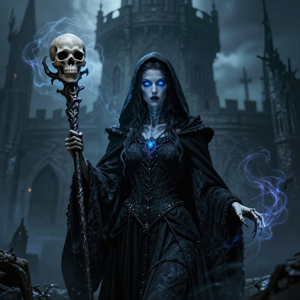 In the style of ckpf, A shadow priestess with flowing midnight robes, her pale skin marked by intricate black tattoos that seem to move and pulse with a dark energy, Her hair, a cascade of raven feathers, frames a face with piercing red eyes gazing with a subtle glow, and she holds a glowing obsidian staff crowned with a floating burning skull, She stands in a gothic temple, shrouded in shadows and illuminated only by an intricate stained glass window in the background