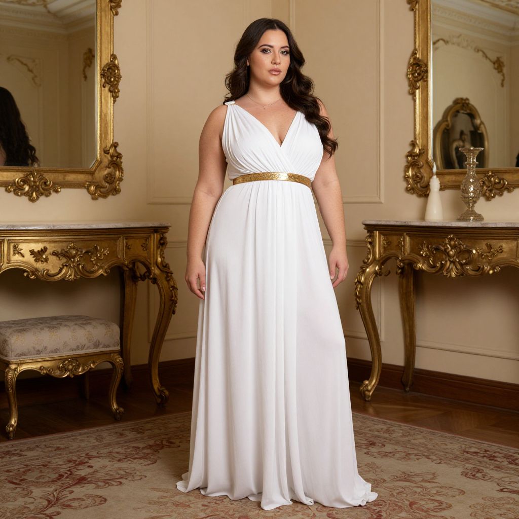Plus Size Grecian Goddess Costume, woman in a white dress standing in a room