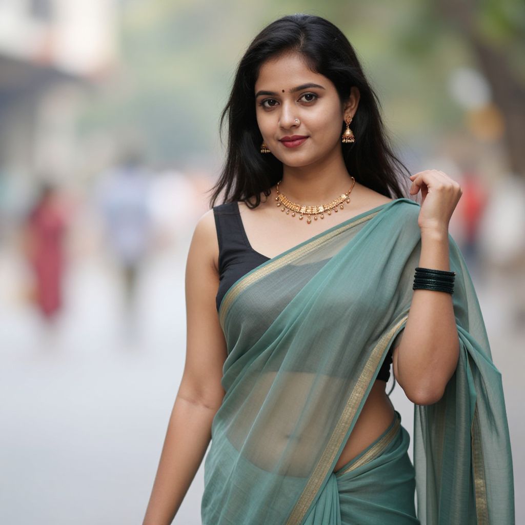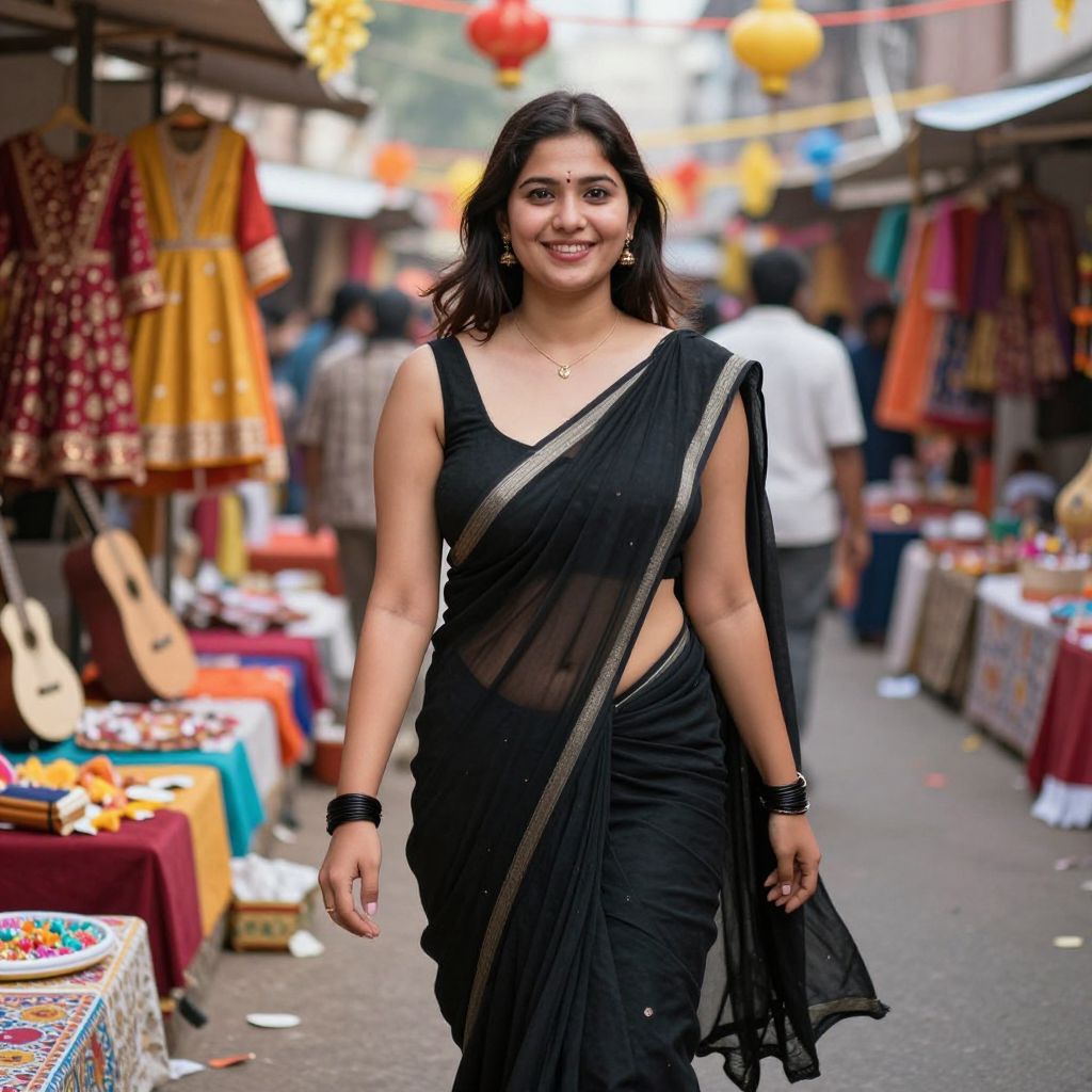 A cultural festival setting in a bustling Indian market where a young woman with fair skin and bright smile wears a black saree with a subtle silver border, walking through colorful stalls with traditional clothing, music, and decorations around her. The woman has big tits and cute face