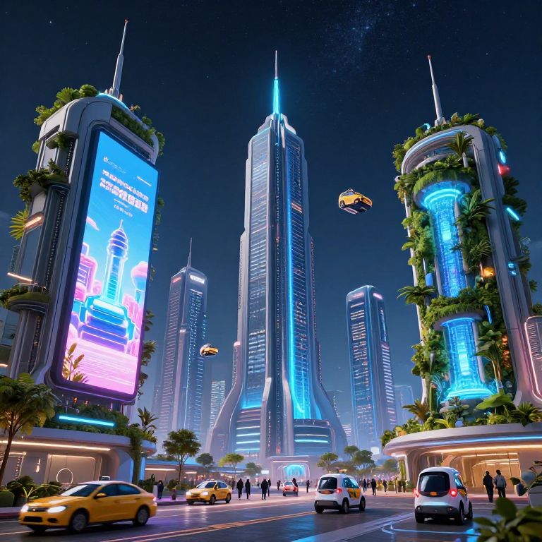 Sci fi futuristic city skyline under a starry sky, colossal digital billboards displaying animated ads, giant energy cores powering the city glowing in blue hues, flying taxis and automated pedestrian robots, lush vertical gardens integrated into skyscrapers, advanced sustainable technology visible