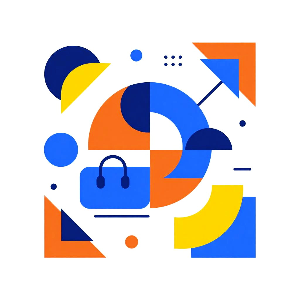 Cosas arranged in an abstract composition, geometric shapes and everyday items blending, modern art style, bold colors, sharp lines, clean digital illustration, minimalistic yet dynamic layout, creative and conceptual design