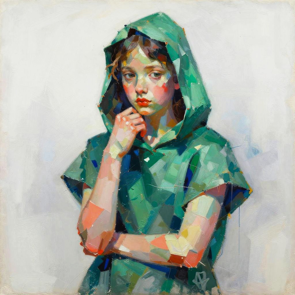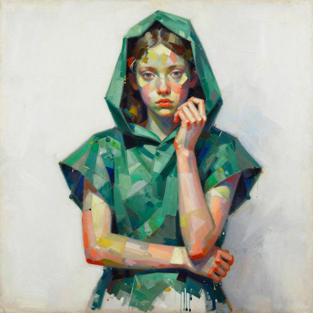Expressionist semi-abstract portrait of fragmented teenage girl in emerald-green hood and fragmented coral limbs, rendered in cubist-infused oil layers with dynamic cross-hatching and rough palette-knife textures, high-contrast bold colors, loose gestural strokes and textured paint ridges, minimal white negative space with asymmetrical crop, cobalt-shadow accents and suggestive contours, emotive eternal longing bound with fleeting melancholia, contemporary art poster vibe, painterly chaos with subtle drips, unresolved edges, luminous highlights.