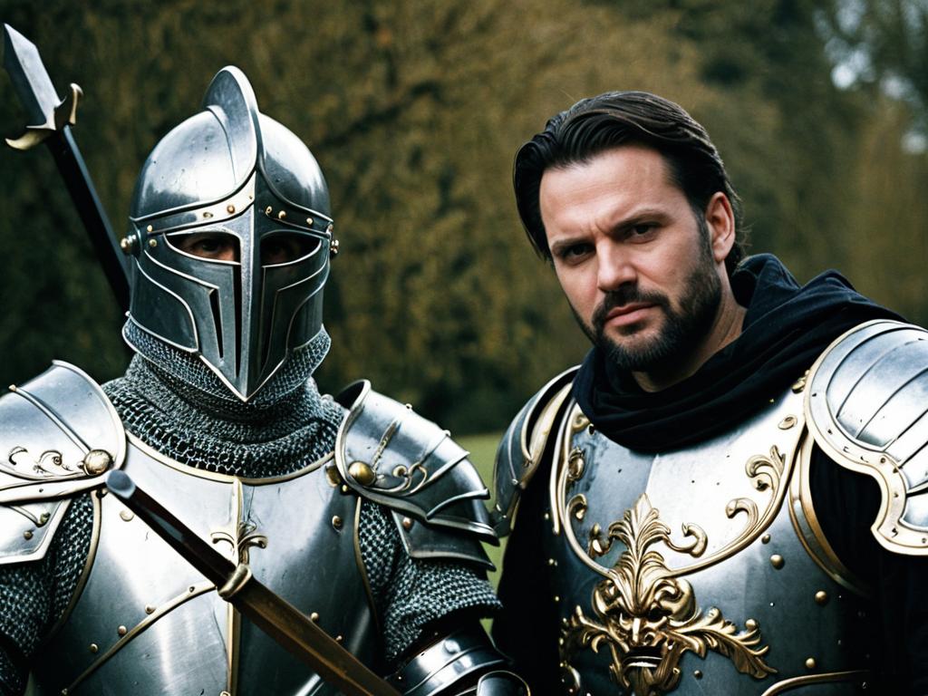 Musketeers Costume Adults face swap, man in medieval armor standing in a hallway