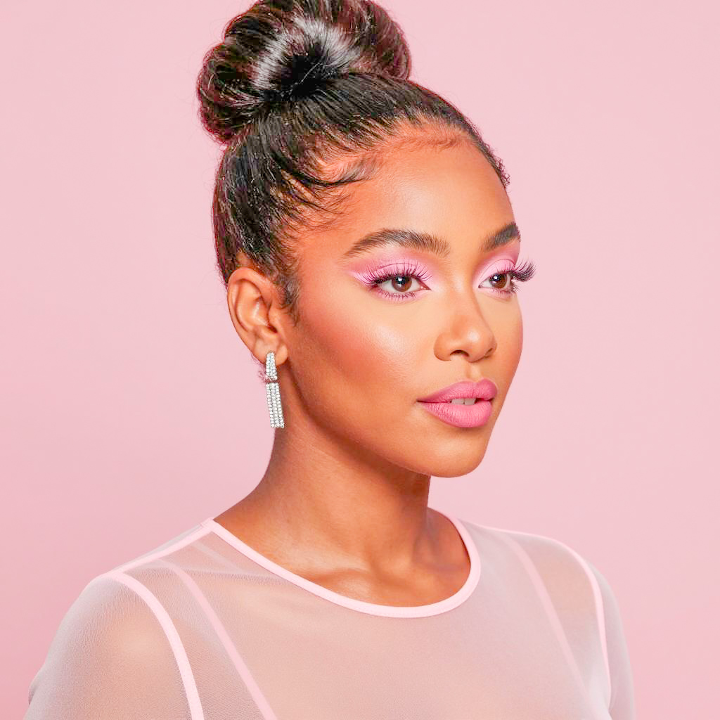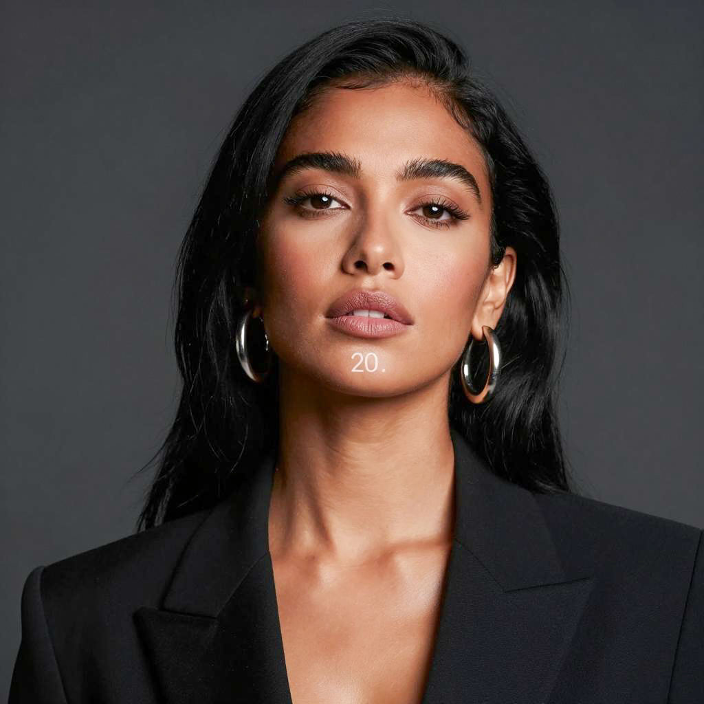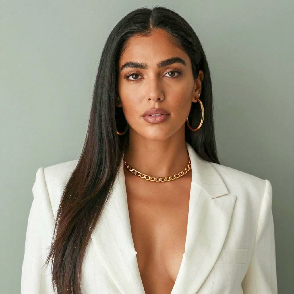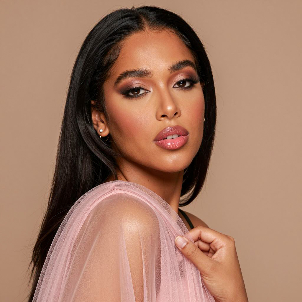 Photograph of a woman with long black hair, light brown skin, and intense makeup. She has dark, defined eyebrows, smoky eye shadow, thick lashes, and glossy pink lips. She wears a light pink, sheer fabric over her shoulder and a small, round earring in her left ear. Her right hand gently holds the fabric. The background is solid light brown. Her expression is confident and slightly pouty.