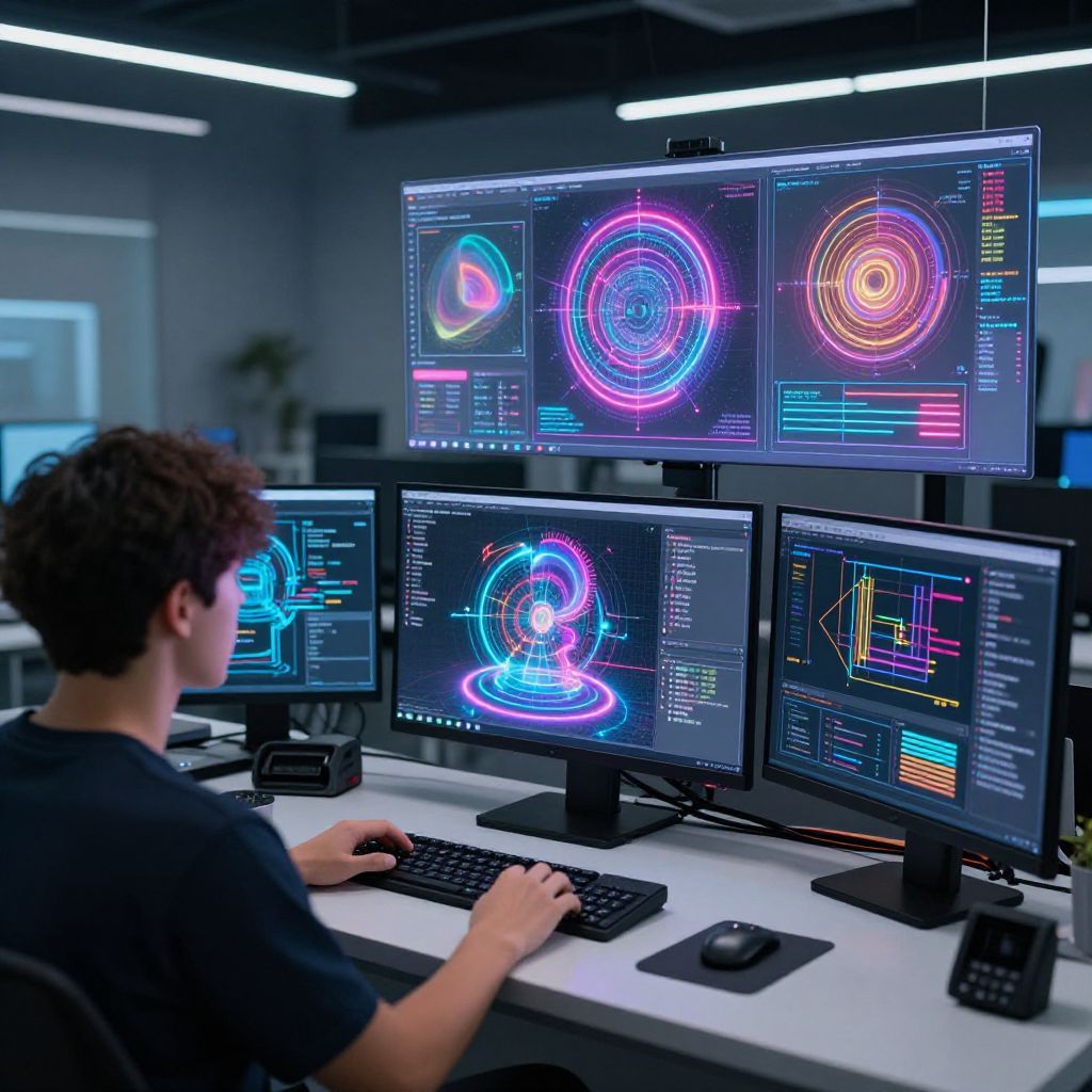Photograph of a young man with curly brown hair, seated at a modern white desk, working on a computer setup with multiple large monitors. The screens display colorful, neon-like digital graphics and data visualization, including vibrant rings and lines in pink, blue, and orange. He wears a black shirt and uses a black keyboard and mouse. The background is a dimly lit, sleek office space with grey walls and fluorescent ceiling lights. The overall scene is futuristic and tech-focused, emphasizing high-tech digital work.