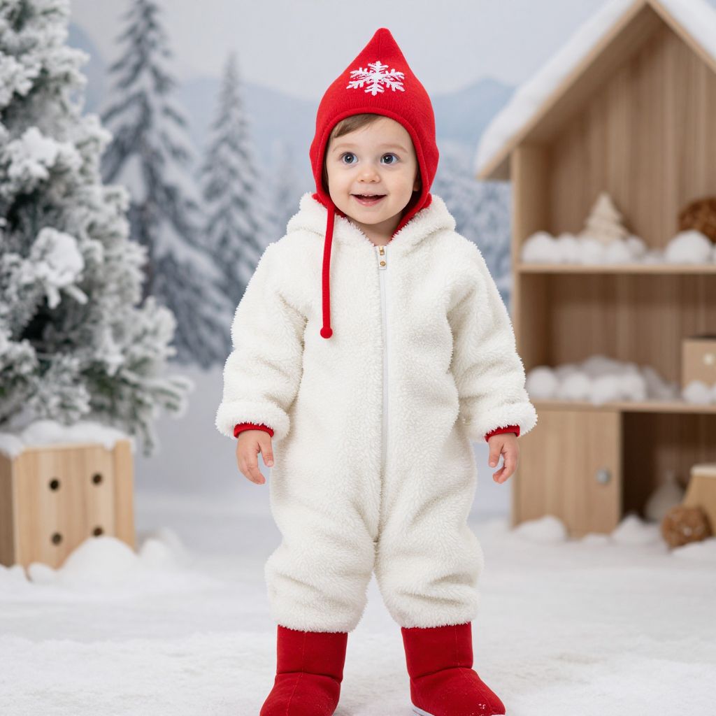A small child wearing a detailed toddler snowsuit costume with a white fleece body, red booties, and a built-in hat with a snowflakes design, standing in a winter-themed indoor playroom with snow-covered decorations, looking upward with wide eyes and a warm smile, soft indoor lighting