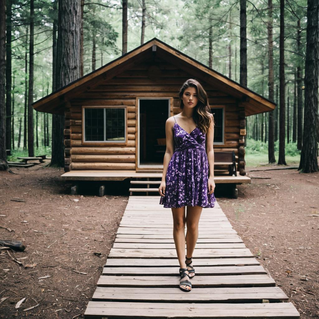 Photograph of a blonde woman with long wavy hair and serious expression standing in front of a small white wooden cabin with a red roof. She is wearing a sleeveless white summer dress with lace detailing and white sandals. The setting is outdoors in a forest with bright daylight and a natural, relaxed summer vibe. Potted flowers and greenery surround the cabin.