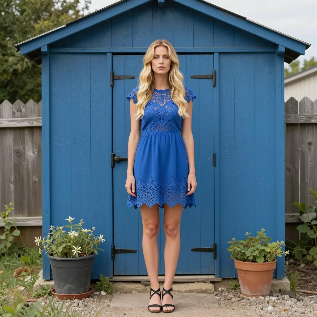 White love shack fancy dress, photograph of a blonde woman standing in front of a small white wooden cabin, wearing a white sleeveless summer dress with lace detailing, sandals, forest background, daytime, bright sunlight, long wavy hair, serious expression, potted flowers on the right, greenery, wooden door, red roof, relaxed summer vibe, natural light, outdoor setting