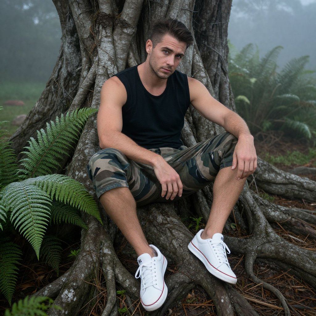 Photograph of a shirtless, muscular young man with short brown hair, wearing dark blue shorts, reclining in a lush, green forest with fern
