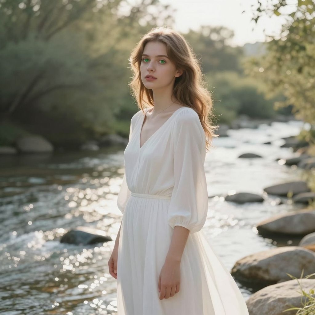 Light brown hair green eyes girl wearing a flowing white dress, standing beside a sparkling river at golden hour, serene expression, natural surroundings, high detail, pastel tones.