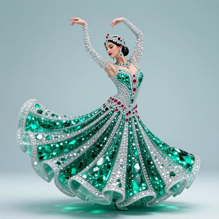 A luminous Spanish dancer, crafted from emeralds, rubies, and diamonds, gracefully twirls in a gown that defies gravity, its cascading layers shimmering like liquid light against an ethereal backdrop.