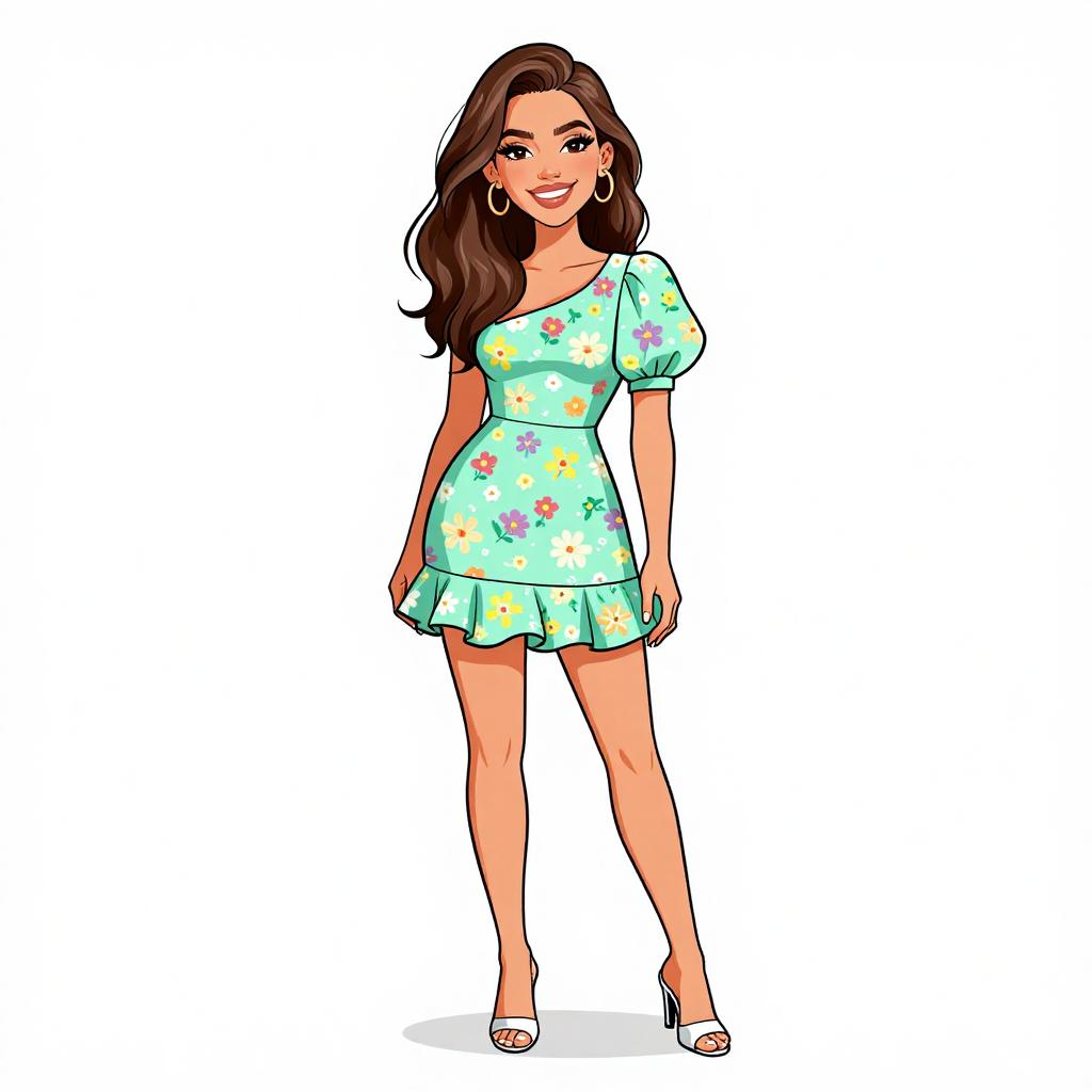 Woman with pretty face and pretty hair. smiling Woman, modern romantic, pale green mini dress with ditsy floral print, asymmetrical neckline, single puff sleeve, fitted bodice, flounced hem, silver open-toe heeled mules, plain white studio background. --sref 1467