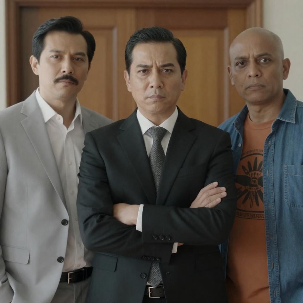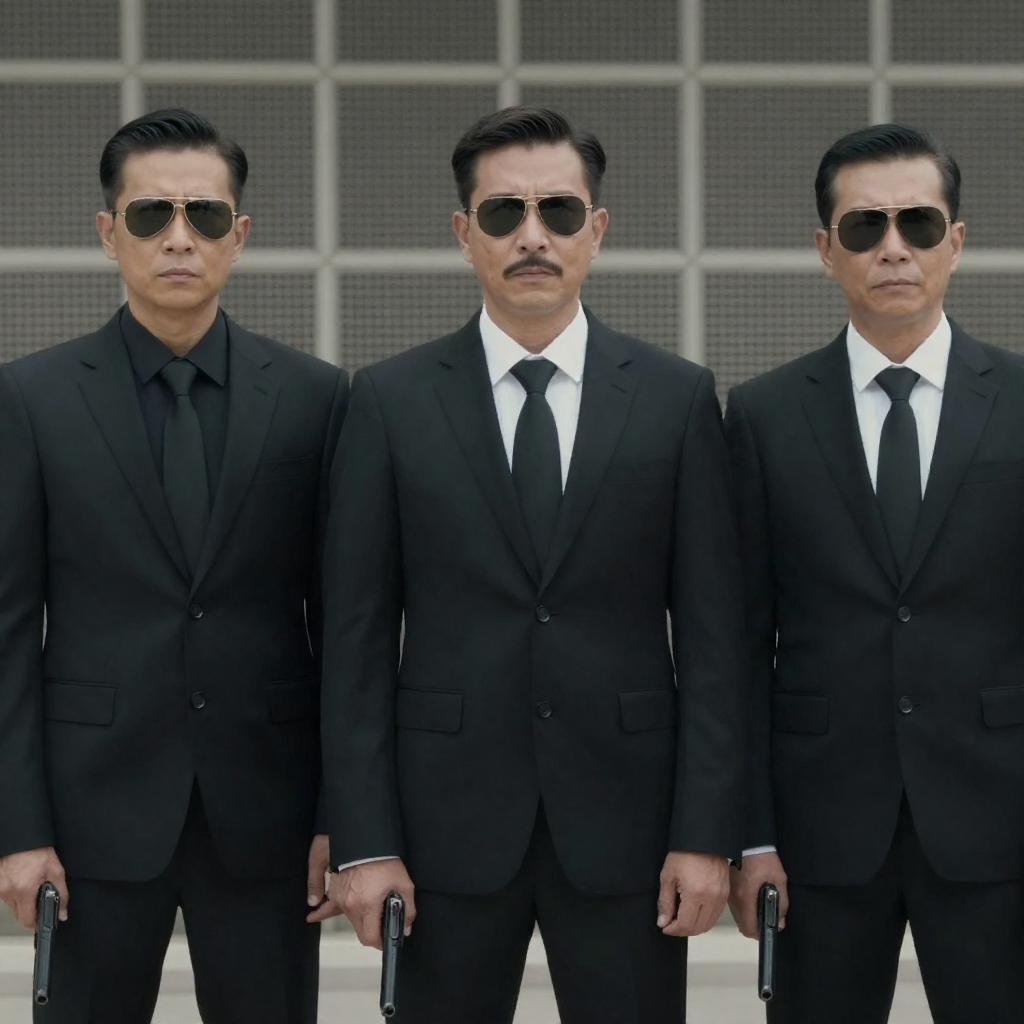 Photograph of three men standing closely together. Central man with crossed arms, serious expression, wearing black suit, patterned tie. Man on left in light gray suit, white shirt, mustache, neutral expression. Man on right in blue shirt, orange graphic tee, balding, neutral expression. Background with blurred wooden doors.