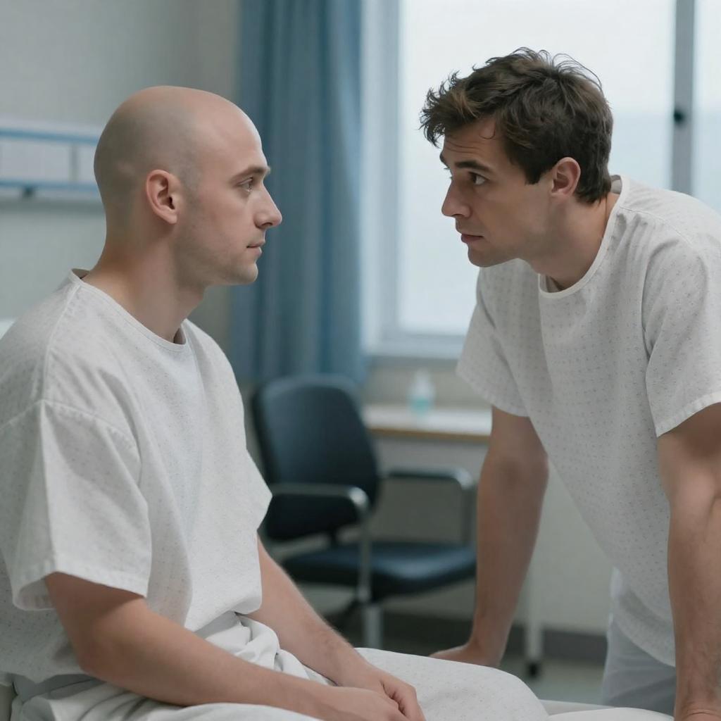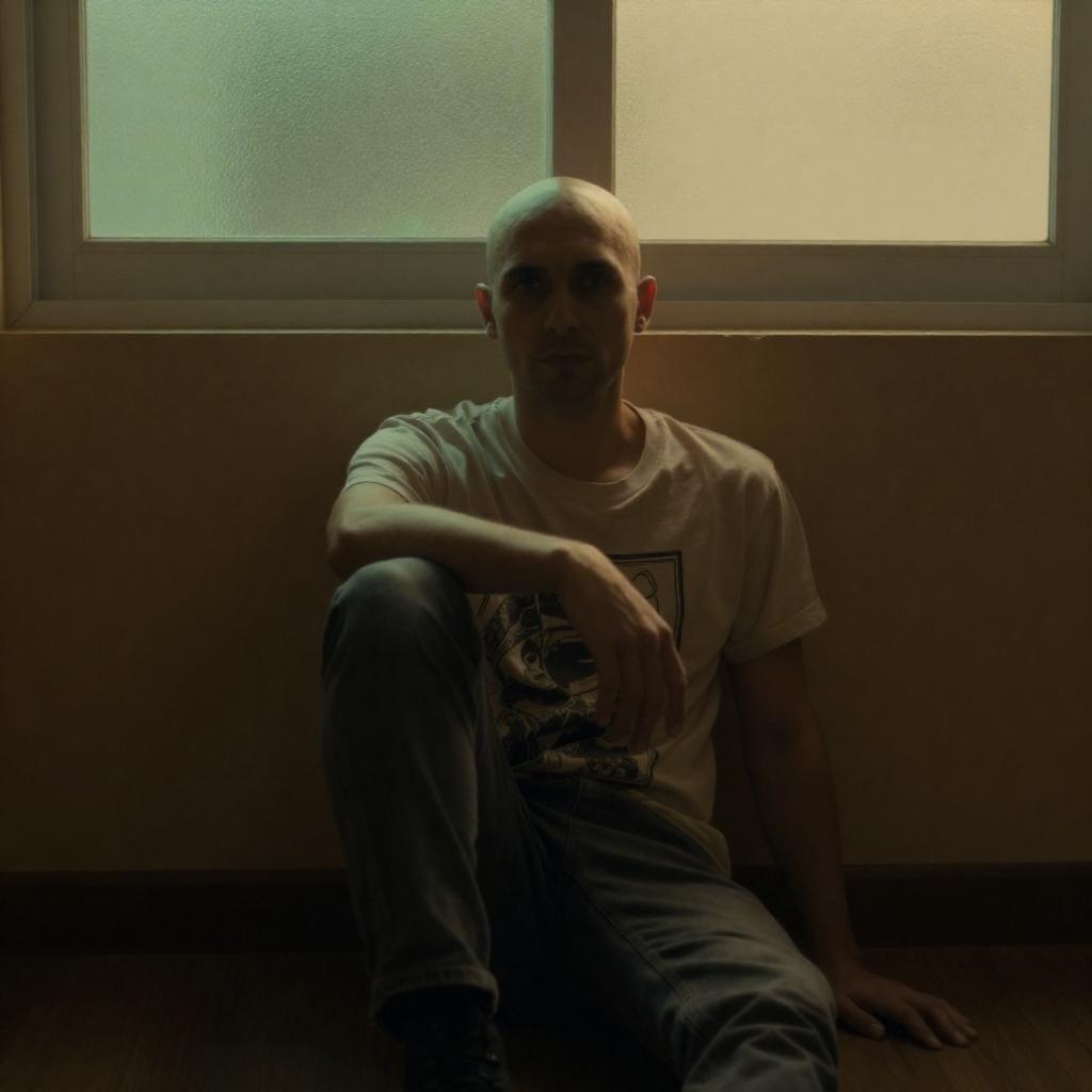 Photograph of a man with a shaved head, wearing a light blue shirt and pants, sitting on the floor with a concerned expression. He is surrounded by four standing men in dark clothing, their legs visible. The background shows a yellow, worn wall with peeling paint and a red cushion on the floor. The floor is wooden.