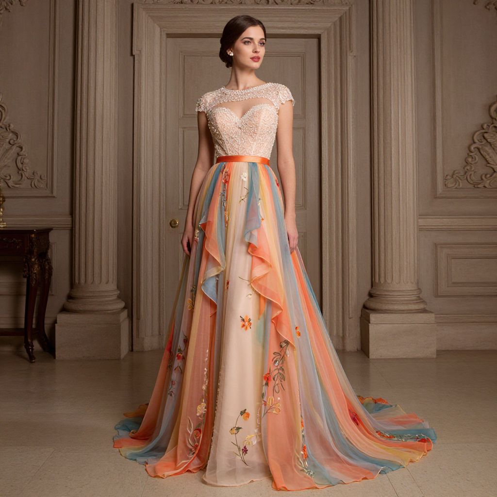 Elegant woman standing gracefully in a custom-made prom dress featuring a delicate lace and pearl embellished bodice, a heart-shaped collar, and a flowing colored organza skirt adorned with floral prints and layered ruffles trailing elegantly on the floor, set against a sophisticated interior with classical columns and ornate details.
