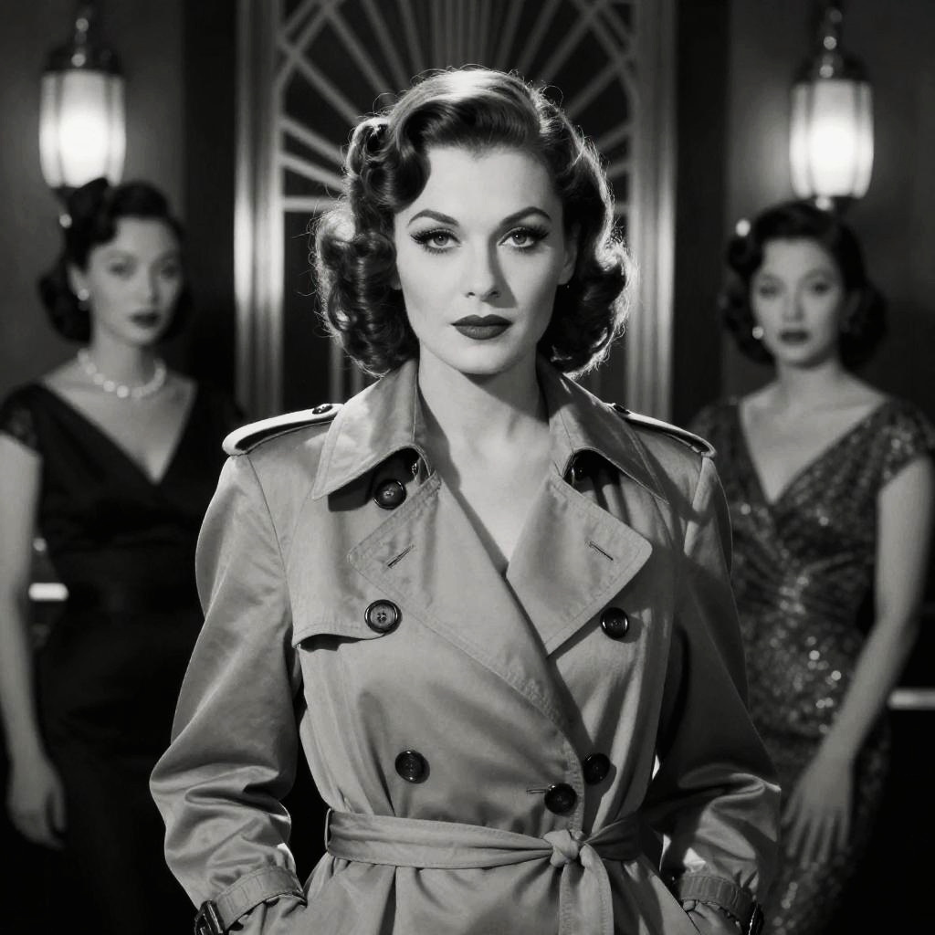 How I would look in the 1930s, portrayed as a glamorous film noir character with dramatic lighting, slicked-back hair or soft curls, wearing tailored trench coats or elegant gowns, black and white style with smoky eyes, set against an art deco backdrop.