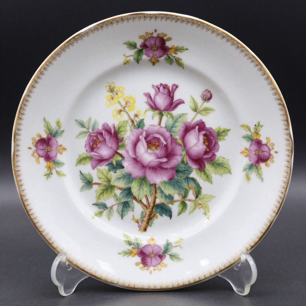 Photograph of an ornate, circular porcelain plate with detailed purple roses, green leaves, and gold-trimmed edges, displayed on a clear stand