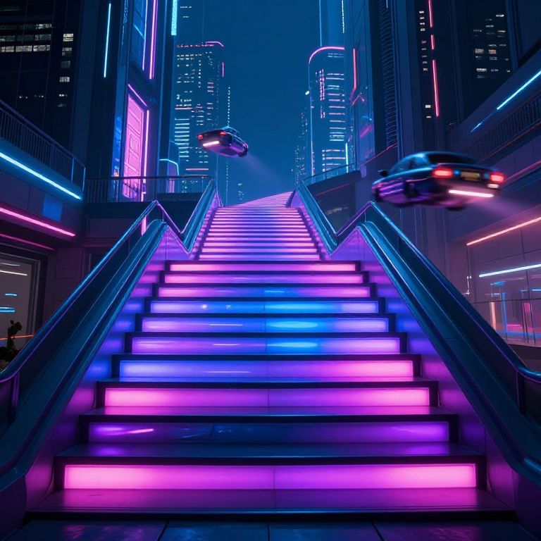 This vibrant digital artwork depicts a futuristic cityscape at night. A neon-lit escalator with glowing blue, pink, and purple steps ascends in the center, flanked by metal handrails. The background features tall skyscrapers adorned with bright, colorful neon signs and lights, creating a cyberpunk aesthetic. Two flying cars, one blue and one red, hover above the escalator. The overall scene is illuminated with a mix of cool and warm neon lights, enhancing the futuristic, urban atmosphere. The artwork uses a high-contrast, saturated color palette to create a visually striking, otherworldly environment.
