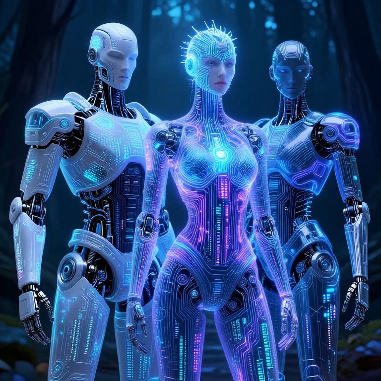 AI graphic generators crafting fantasy characters, humanoid robots with ethereal glowing circuits, intricate armor made from digital code fragments, vibrant color palette with blues and purples, detailed cybernetic enhancements, set against a dark cyber forest background.
